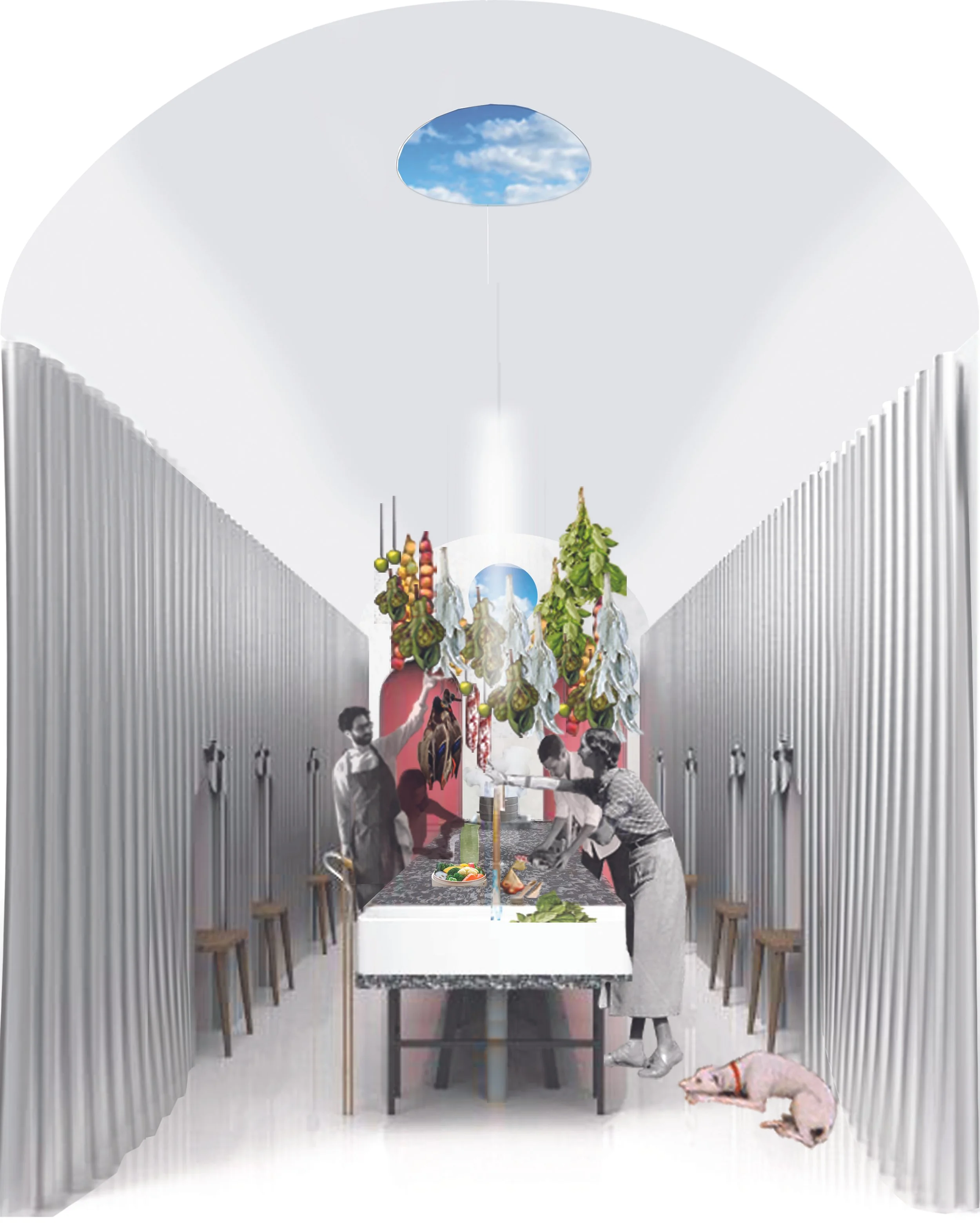 ‘The service may start. Each visitor becomes a guest, observer or part of the action. They will treat or be treated. There are no rules or roles. The pulse of the kitchen, often hidden behind doors, is unravelled, exposed and elevated as a ritualistic process. Kitchen worktop and dining table are amalgamated, rescuing memories of eating while mum is cooking; tasting the dough before it turns into a cake.
