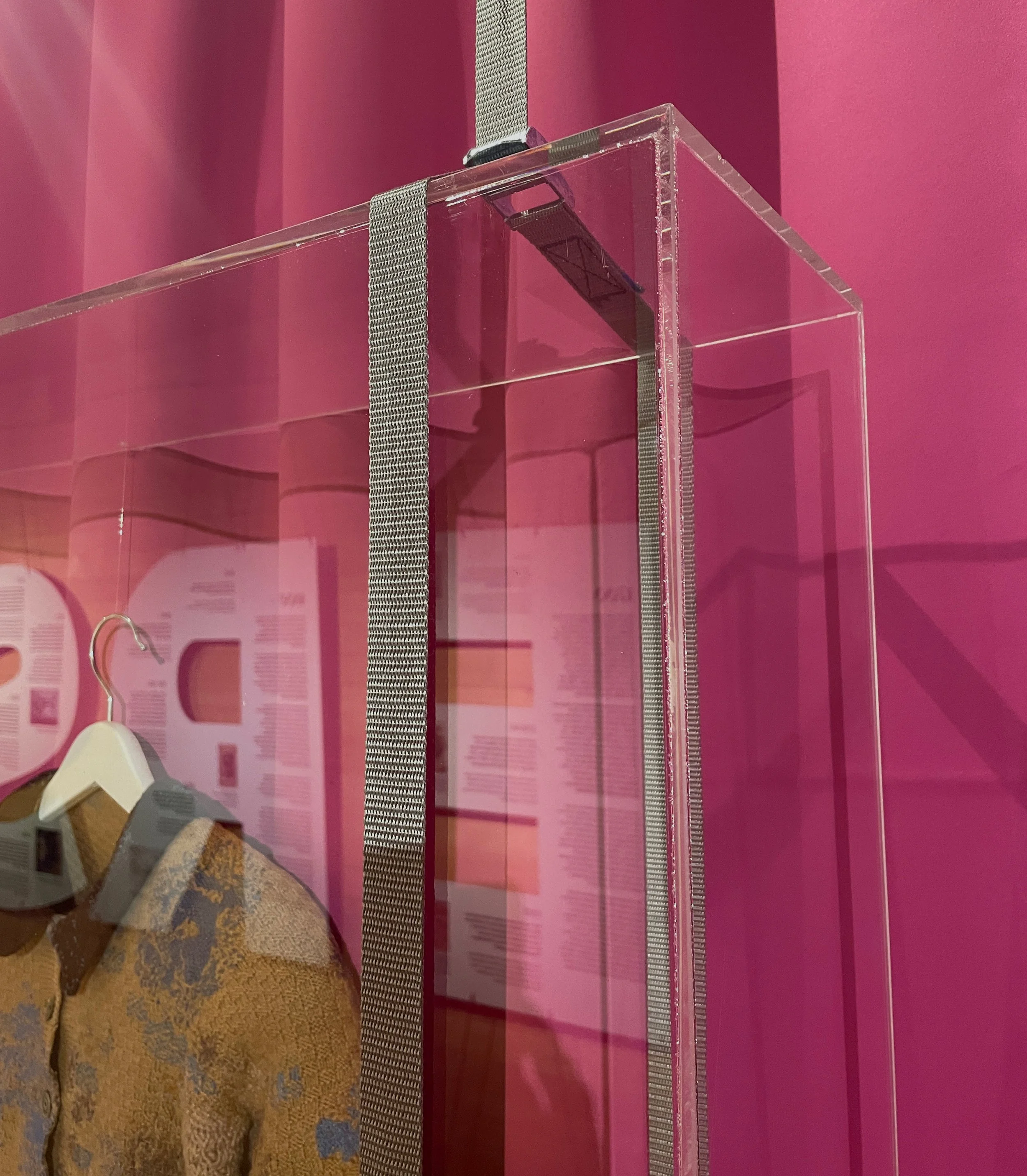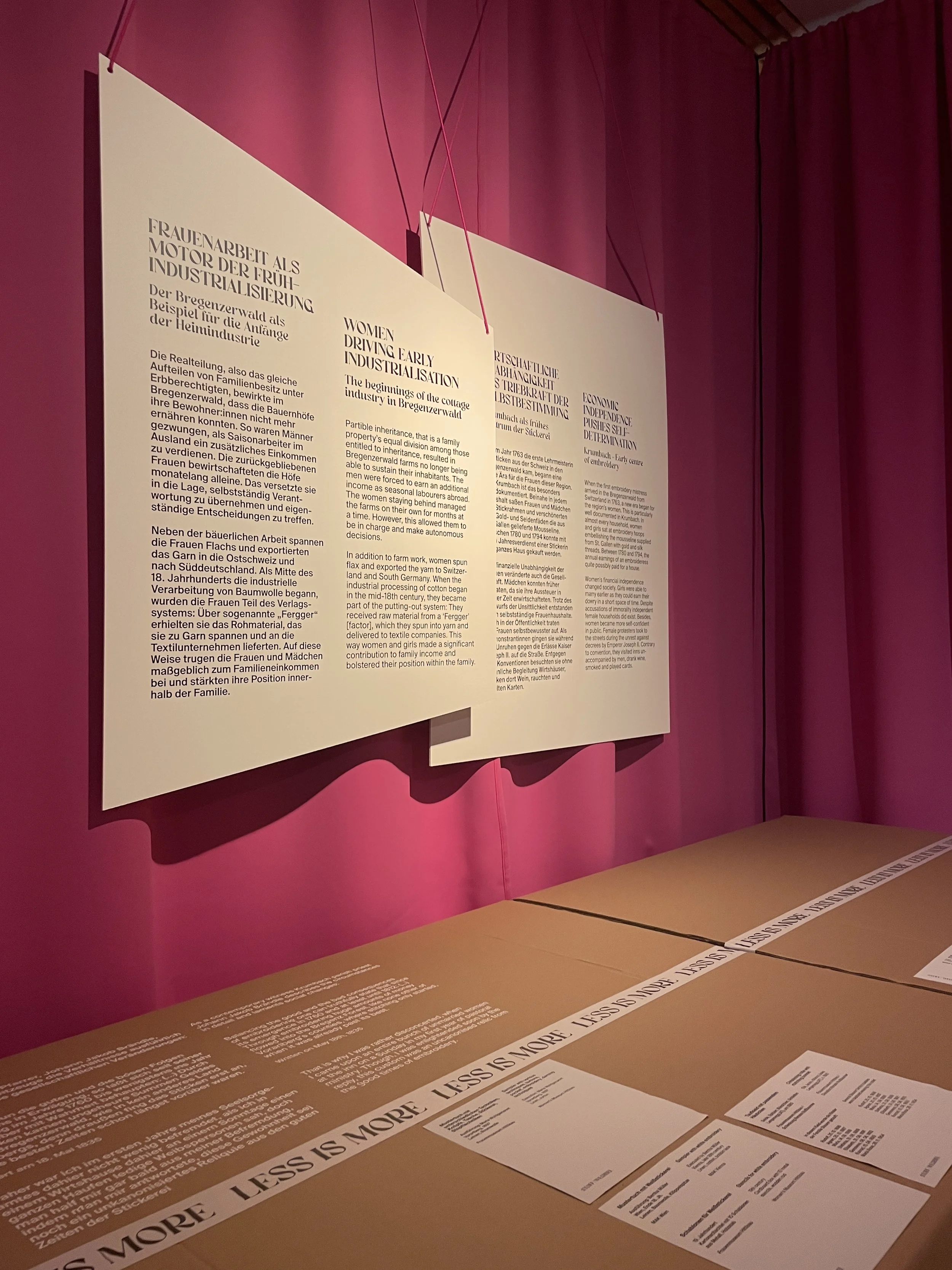 Our exhibition design incorporates reusable, and recyclable materials. Stacked cardboard boxes are arranged in a rectangular layout, forming the core structure as display surface and recessed vitrines. A bold pink curtain shields the artwork from direct daylight, creating a "room within a room" for visitors to engage with the main body of work. Strapping ropes suspend showcases, adding an industrial edge, while packaging tape secures the boxes, referencing delivery packaging and fast fashion. Interactive elements for all ages are a key part of the experience, providing visitors with the opportunity to feel various fabrics and learn surprising facts about their origin and composition.